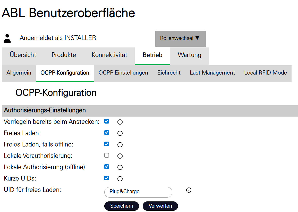 Before starting the configuration, please check the charger firmware version complies with the latest compatible firmware version.Connection to the chargerThe ABL web portal can be accessed by entering the wallbox IP-address in the web browser. On the web page you can change the role to installer at “Change role” for Admin/Edit mode.