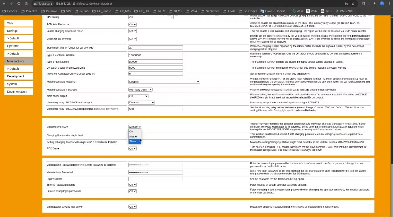 The tab “Manufacturer” is available only in the web interface with the charger FW version ≥6.1 With the FW version below 6.1 please use the link http://192.168.123.123:81/legacy/manufacturer/manufacturer or http://<IP>:81/legacy/manufacturer/manufacturer The settings e.g. backend url, chargerId for the Master will be applied to the Slave(s) | |